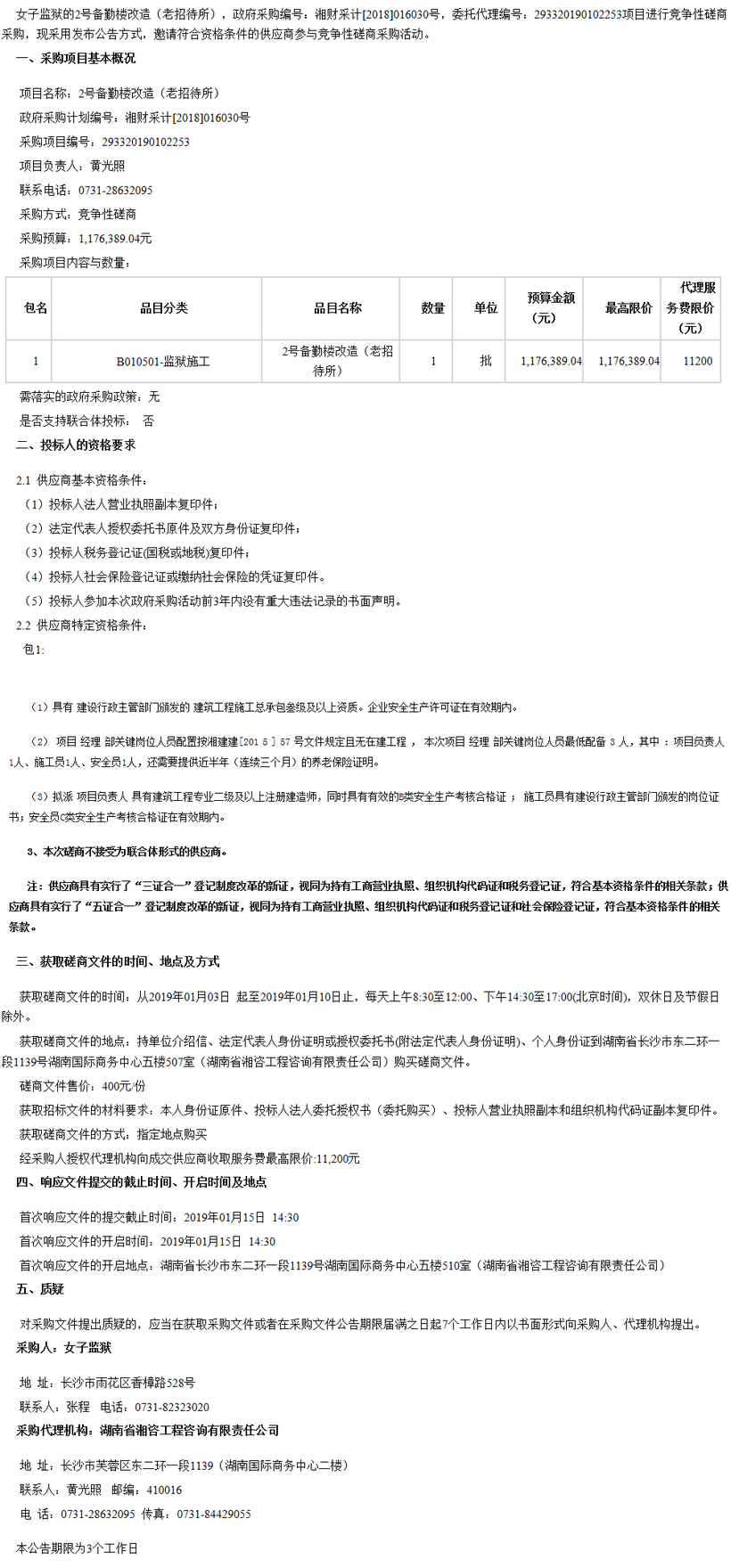 湖南省女子監獄2號備勤樓改造(老招待所)工程磋商邀請
