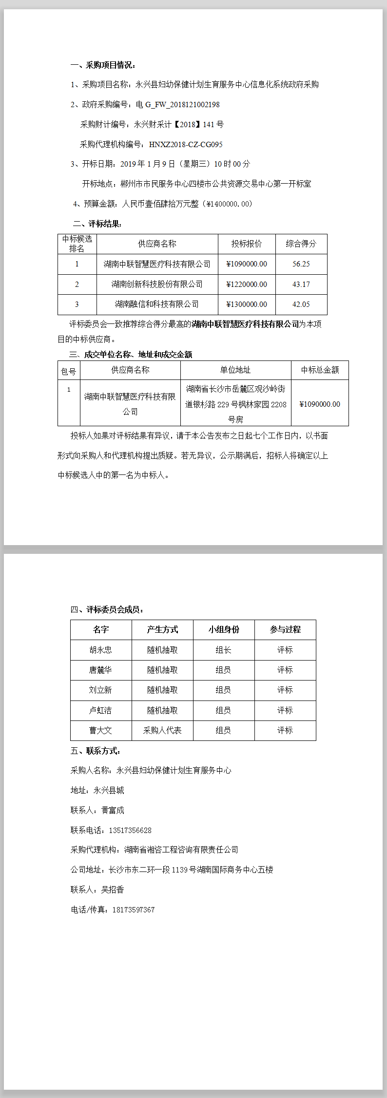 永興縣婦幼保健計劃生育服務(wù)中心信息化系統(tǒng) 政府采購中標(biāo)結(jié)果公示