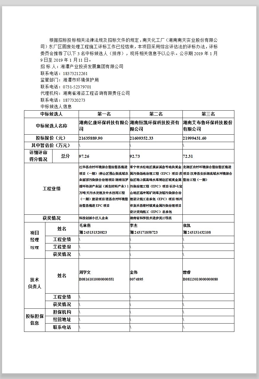 南天化工廠(湖南南天實(shí)業(yè)股份有限公司)東廠區(qū)固廢處理工程施工中標(biāo)候選人公示