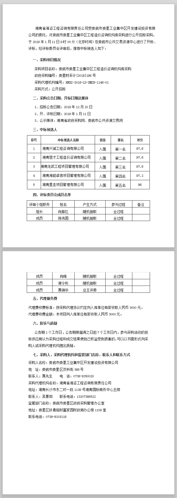 婁底市婁星工業集中區工程造價咨詢機構庫采購公開招標中標公告