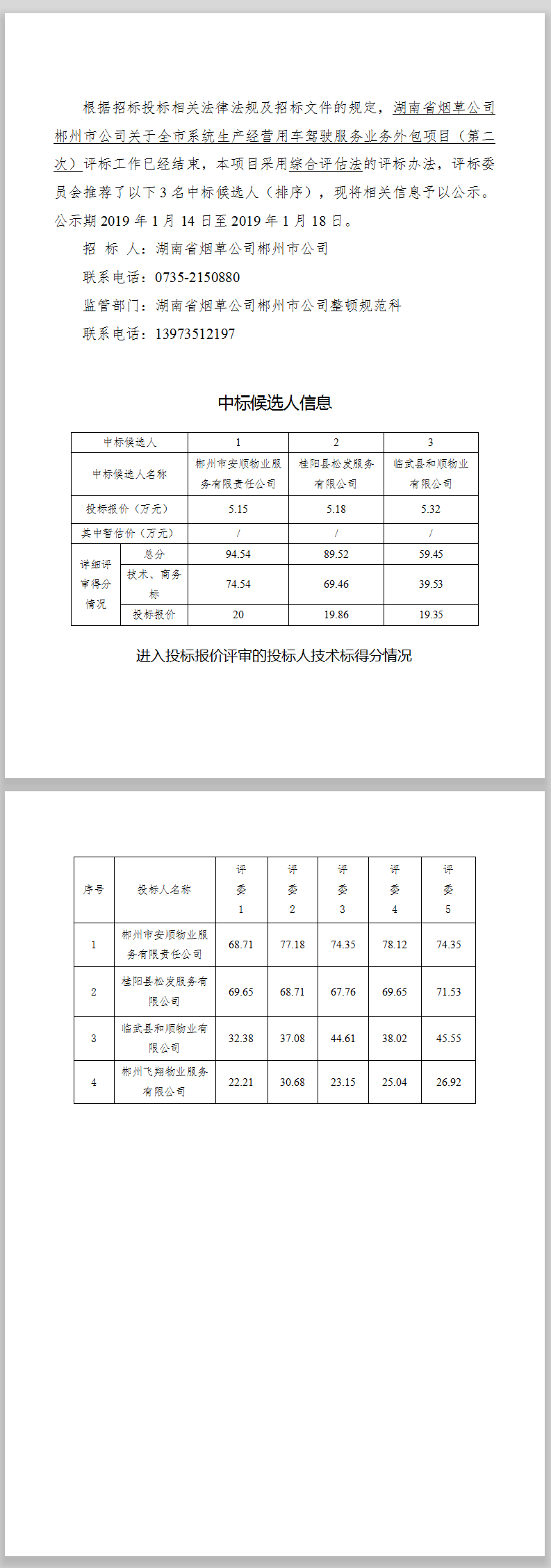 湖南省煙草公司郴州市公司關于全市系統生產經營用車駕駛服務業務外包項目(第二次)中標候選人公示