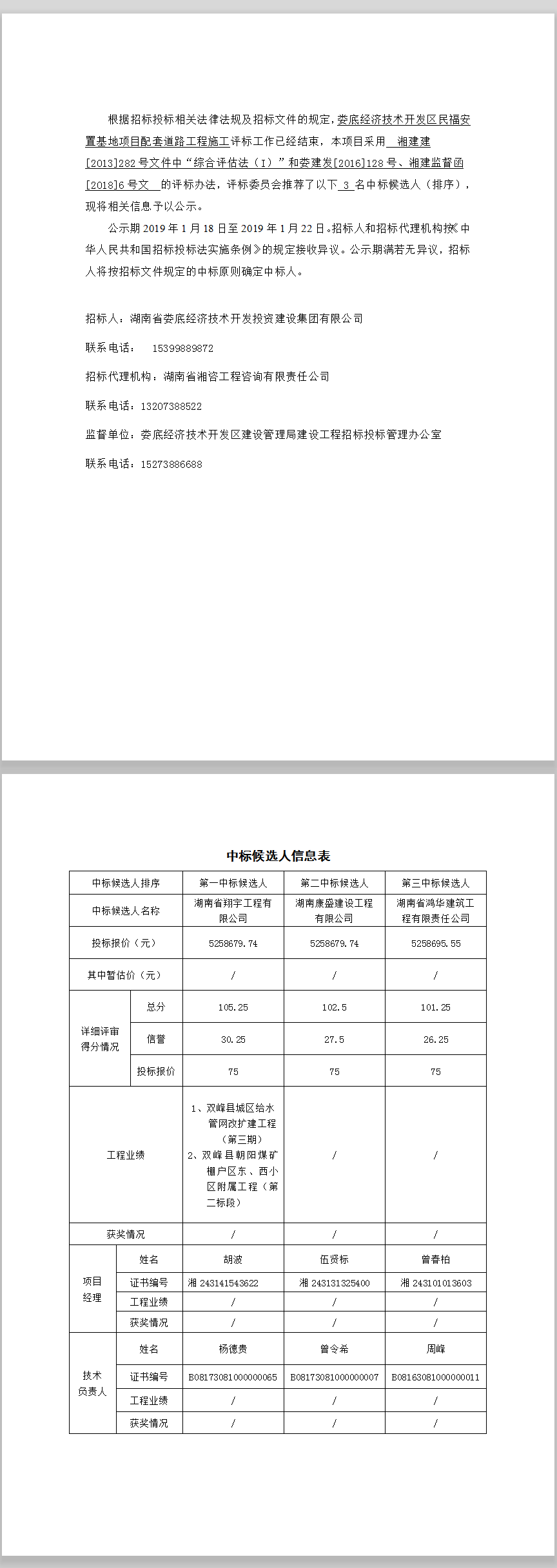 婁底經(jīng)濟(jì)技術(shù)開發(fā)區(qū)民福安置基地項(xiàng)目配套道路工程施工中標(biāo)候選人公示