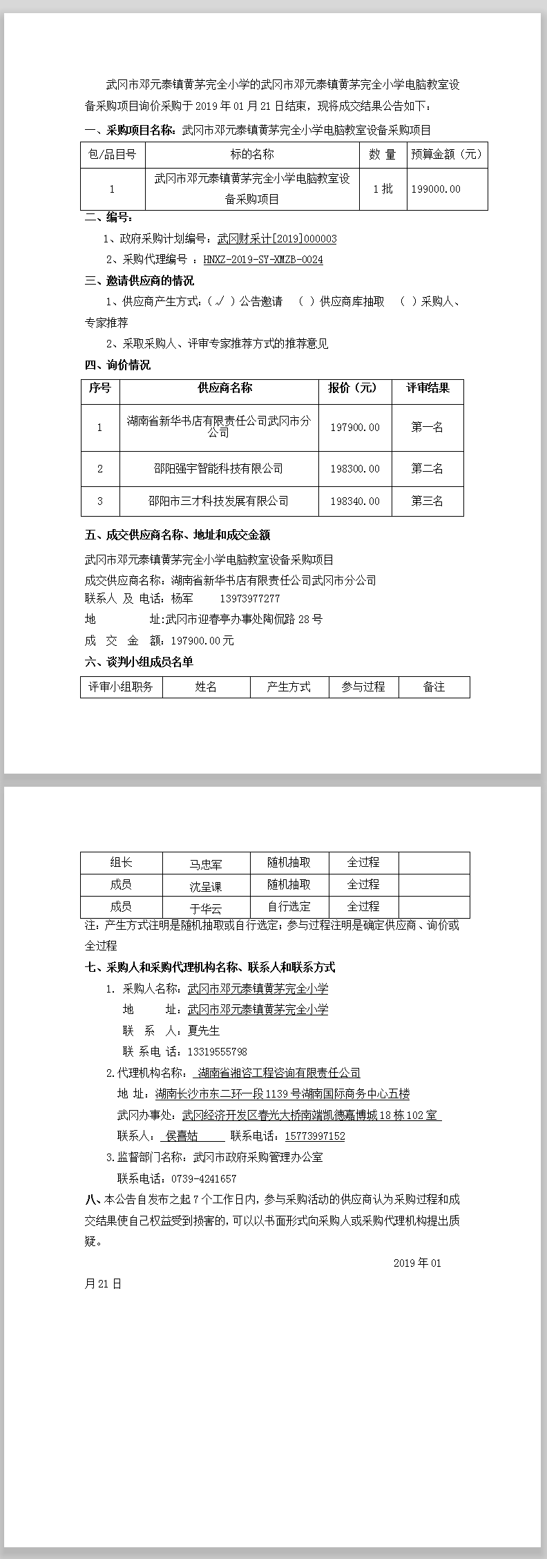 武岡市鄧元泰鎮黃茅完全小學電腦教室設備采購項目詢價成交結果公告