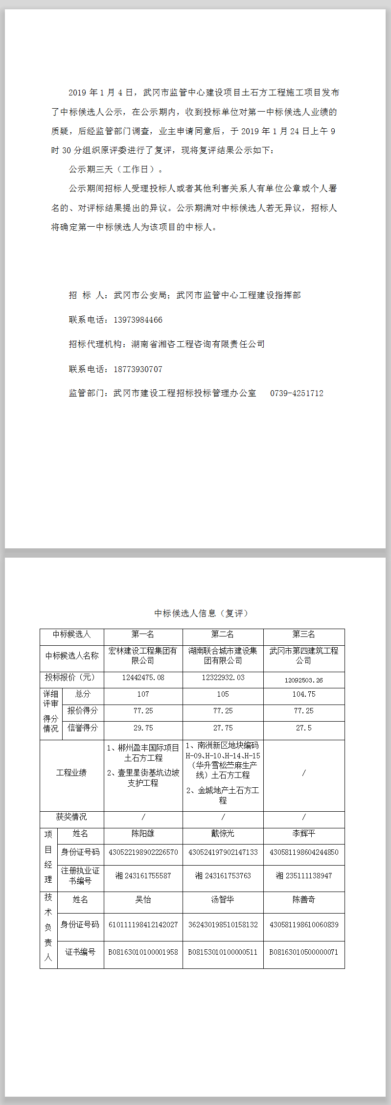 武岡市監管中心建設項目土石方工程施工中標候選人公示(復評)