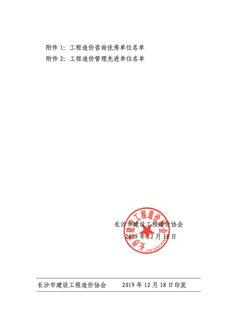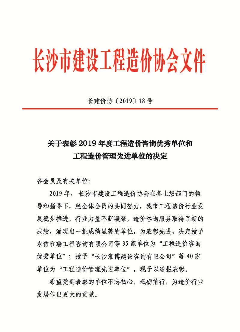 【喜訊】熱烈慶祝我司榮獲長沙市建設工程造價協會2019年度工程造價咨詢優秀單位