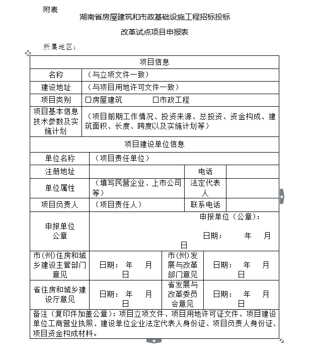 1.申報材料。項目申報單位可根據《試點方案》要求,填寫《湖南省房屋建筑和市政基礎設施工程招標投標改革試點項目申報表》(可在湖南省建設工程招標投標網http://www.hnztb.org/自行下載),并將其他相關材料編制成冊(一式三份蹋并附全套資料的電子文檔。