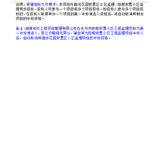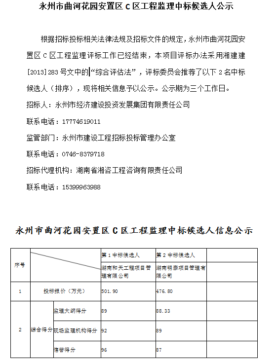 永州市曲河花園安置區C區工程監理中標候選人公示
