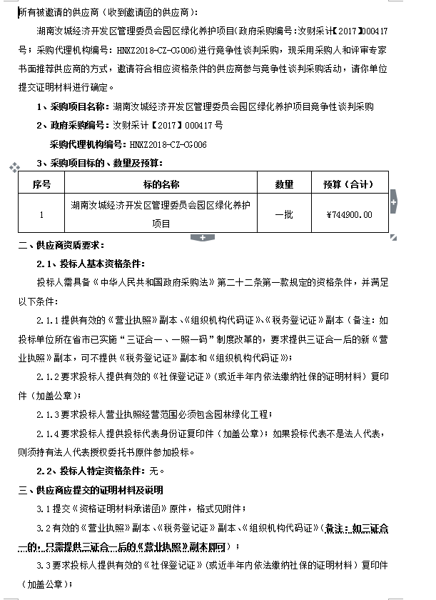 湖南汝城經濟開發區管理委員會園區綠化養護項目競爭性談判采購談判邀請通知