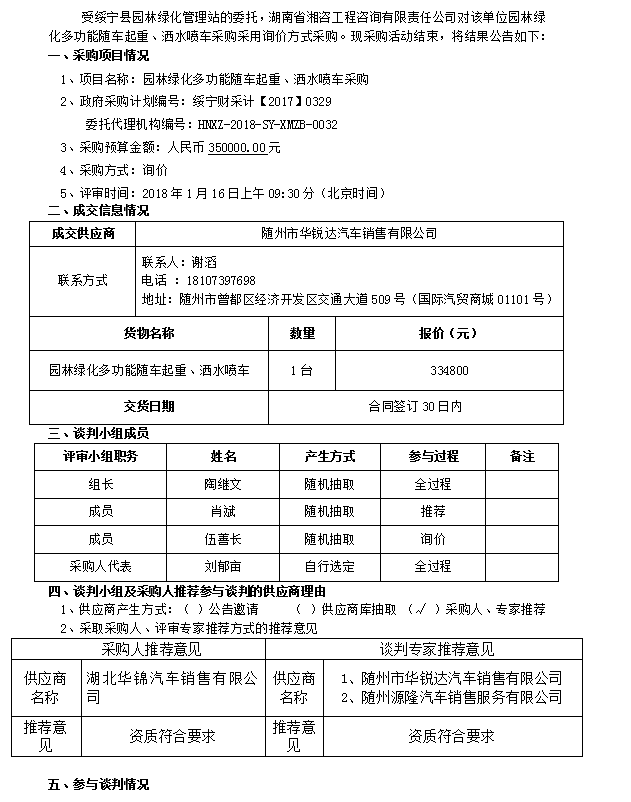 園林綠化多功能隨車起重、灑水噴車采購成交公告