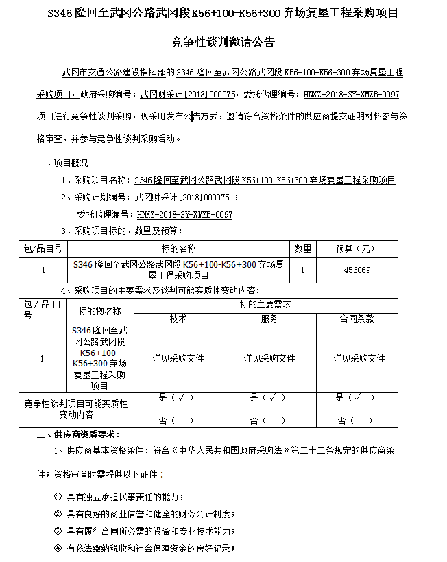 S346隆回至武岡公路武岡段K56+100-K56+300棄場復墾工程采購項目 競爭性談判邀請公告