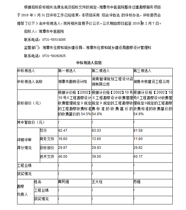 湘潭市中醫(yī)醫(yī)院整體遷建勘察服務項目中標候選人公示