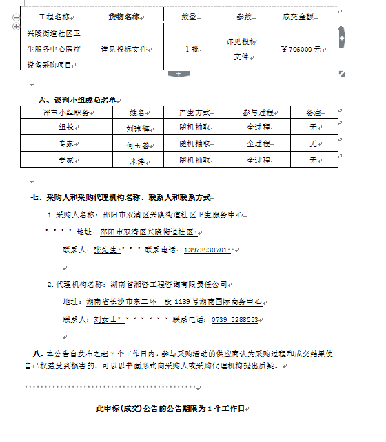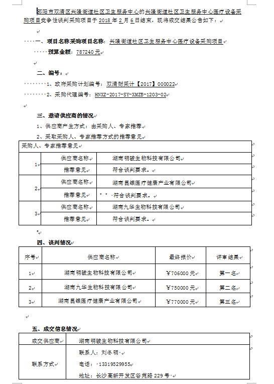 興隆街道社區衛生服務中心醫療設備采購項目談判成交公告