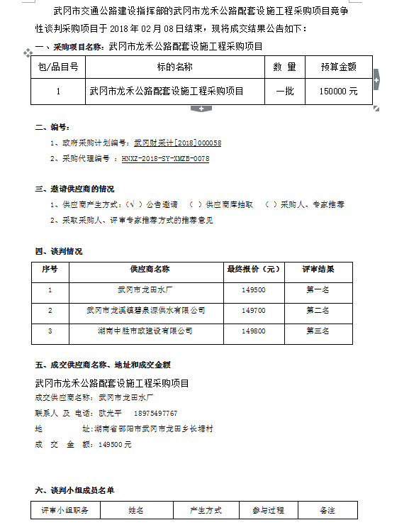 武岡市龍禾公路配套設施工程采購項目 競爭性談判成交結果公告