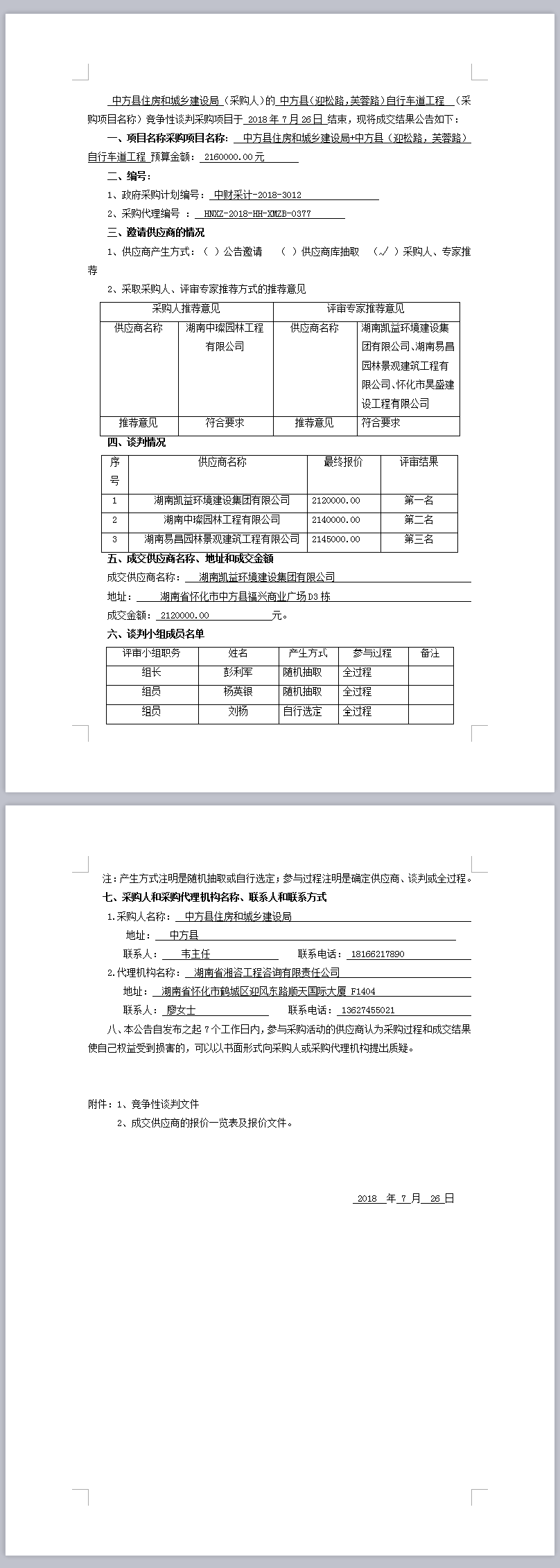 中方縣住房和城鄉建設局+中方縣(迎松路,芙蓉路)自行車道工程競爭性談判成交結果公告