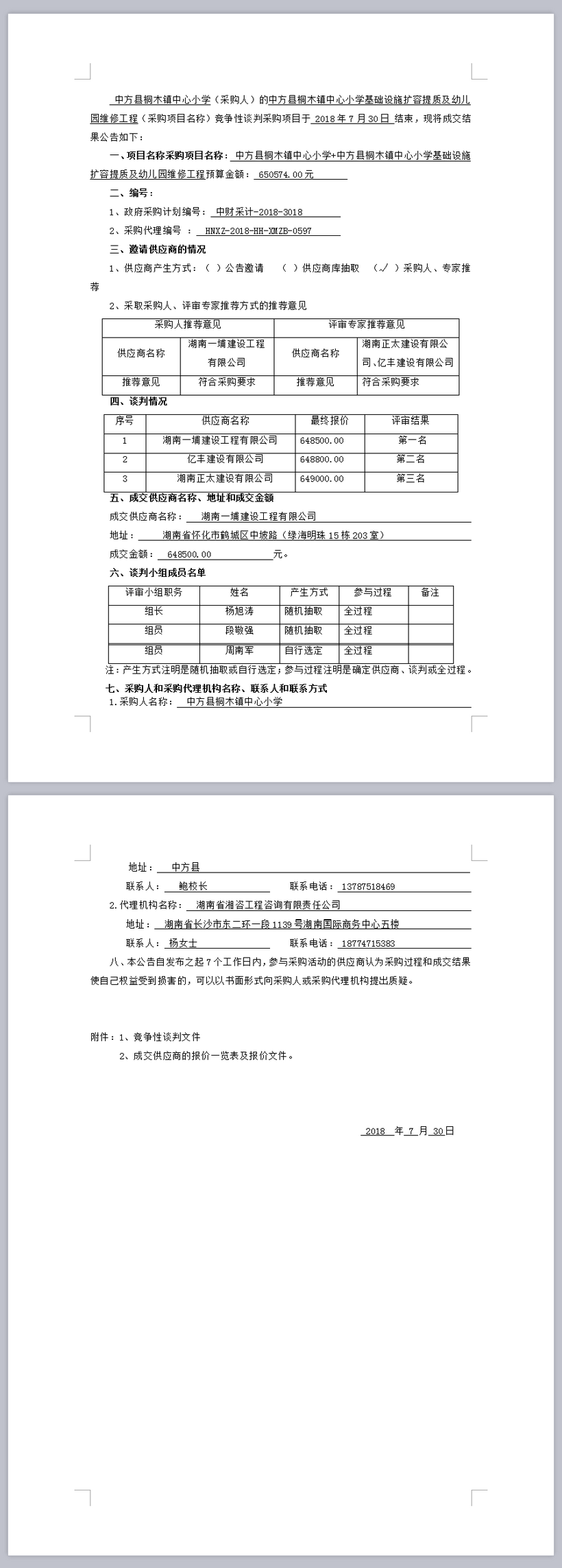 中方縣桐木鎮中心小學+中方縣桐木鎮中心小學基礎設施擴容提質及幼兒園維修工程競爭性談判成交結果公告