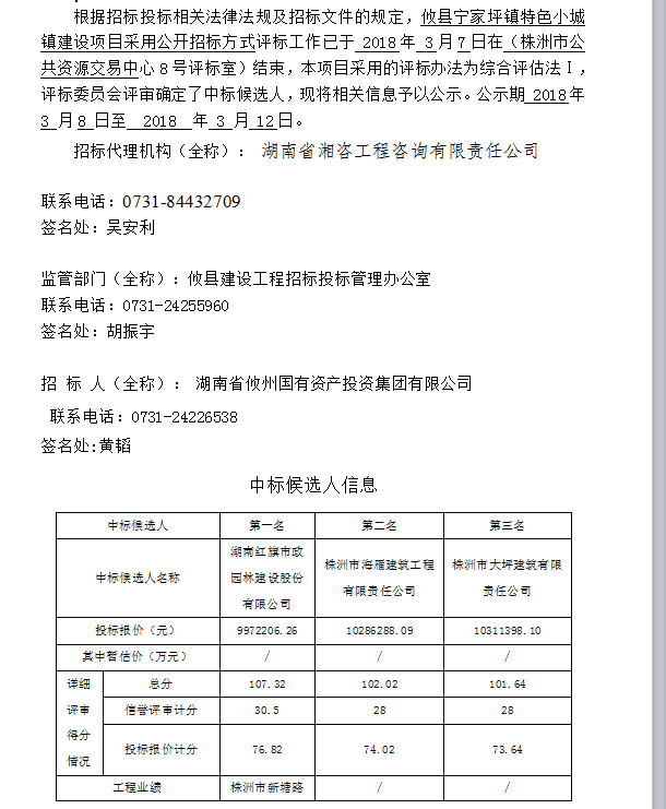 攸縣寧家坪鎮特色小城鎮建設項目施工招標投標信息公示表