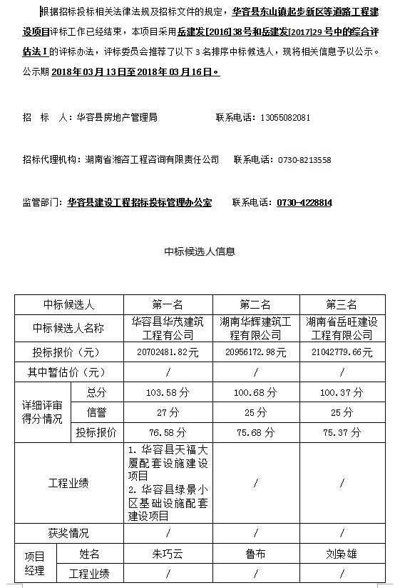 華容縣東山鎮起步新區等道路工程建設項目中標候選人公示