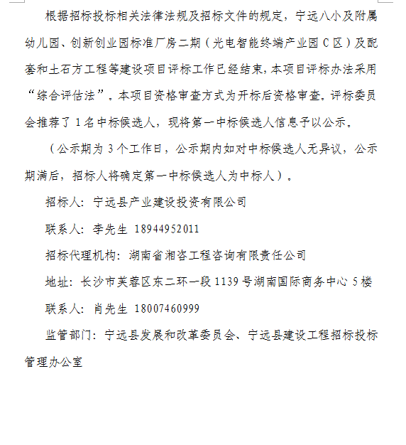 寧遠八小及附屬幼兒園、創新創業園標準廠房二期(光電智能終端產業園C區)及配套和土石方工程等建設項目中標候選人信息公示