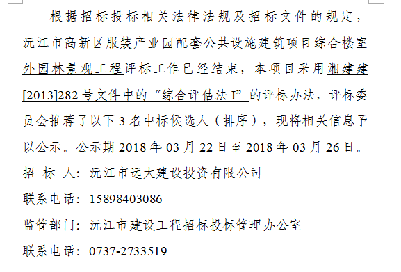 沅江市高新區服裝產業園配套公共設施建筑項目綜合樓室外園林景觀工程中標候選人公示