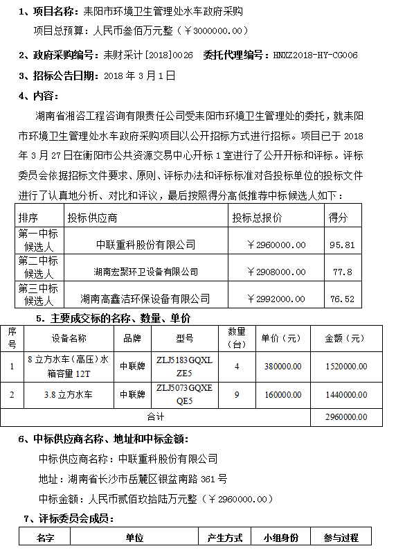 耒陽市環(huán)境衛(wèi)生管理處水車政府采購評標(biāo)結(jié)果公示