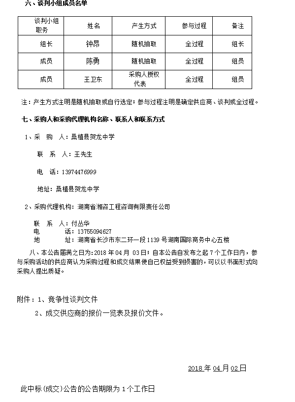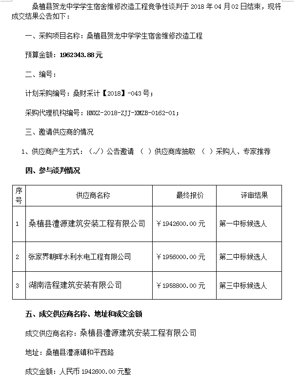 桑植縣賀龍中學學生宿舍維修改造工程競爭性談判 成交結果公告