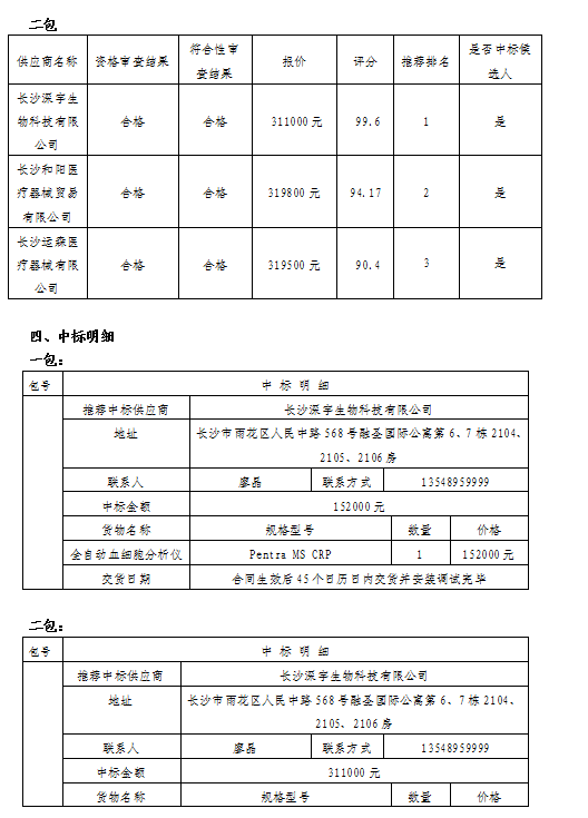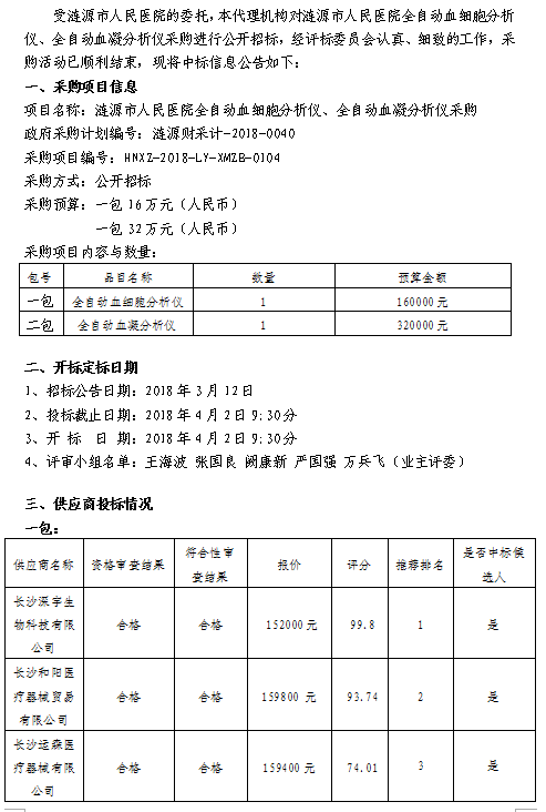 漣源市人民醫院全自動血細胞分析儀、全自動血凝分析儀采購中標結果公告