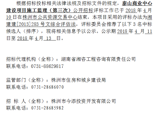 泰山商業中心建設項目施工監理(第三次)招標投標信息公示表