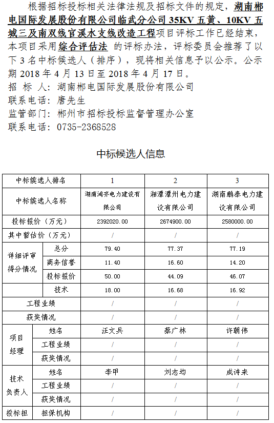 湖南郴電國際發(fā)展股份有限公司臨武分公司35KV五黃、10KV五城三及南雙線官溪水支線改造工程 中標候選人公示
