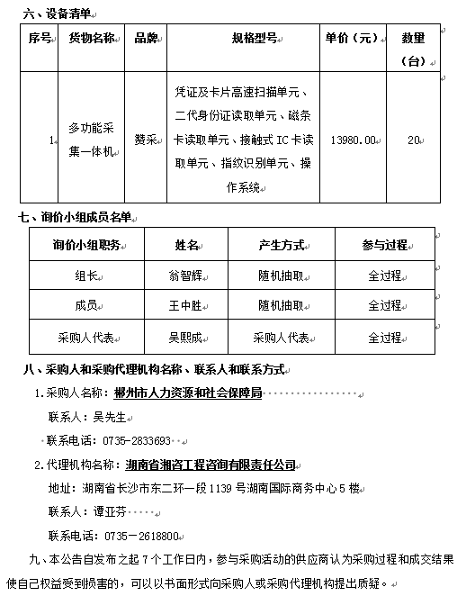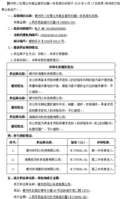 郴州市人社局公共就業服務掃描一體機詢價采購成交結果公告