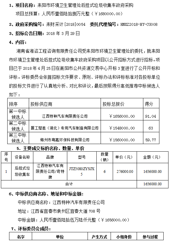 耒陽市環境衛生管理處后掛式垃圾收集車政府采購 評標結果公示
