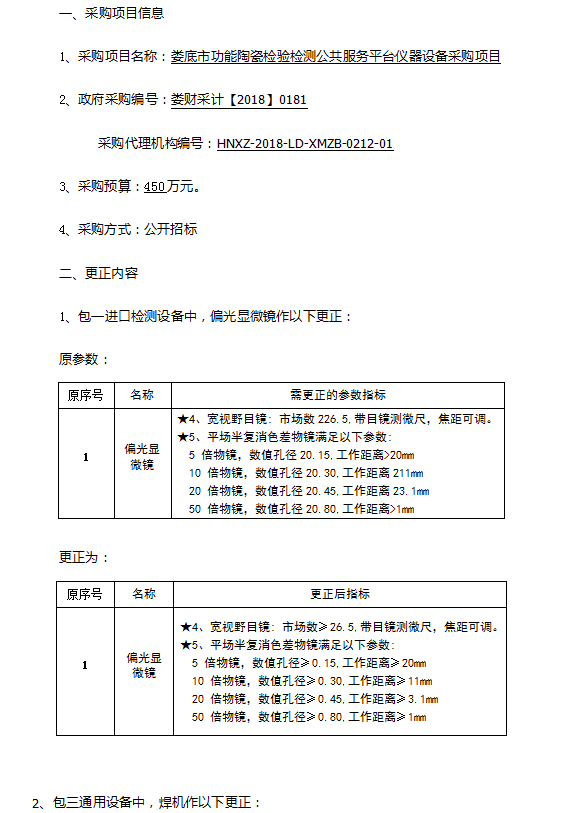 婁底市功能陶瓷檢驗檢測公共服務(wù)平臺儀器設(shè)備采購更正公告
