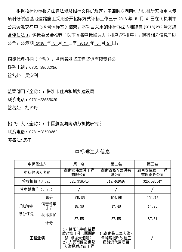 中國航發湖南動力機械研究所重大專項科研試驗基地道路施工 招標投標信息公示表