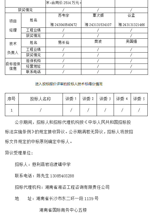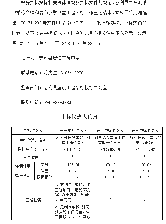 慈利縣巖泊渡鎮中學綜合樓和巖市小學食堂工程施工招標投標信息公示表